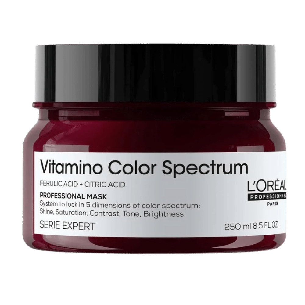 La mascarilla Vitamino Color Spectrum de L’Oréal Professionnel es el tratamiento hidratante intensivo que sella y protege el color como el primer día por hasta 100 días*. Gracias a su fórmula profesional con ácido ferúlico y ácido cítrico, fija los tintes dentro de la fibra capilar, potenciando las 5 dimensiones del color**: brillo, saturación, contraste, tono y luminosidad.